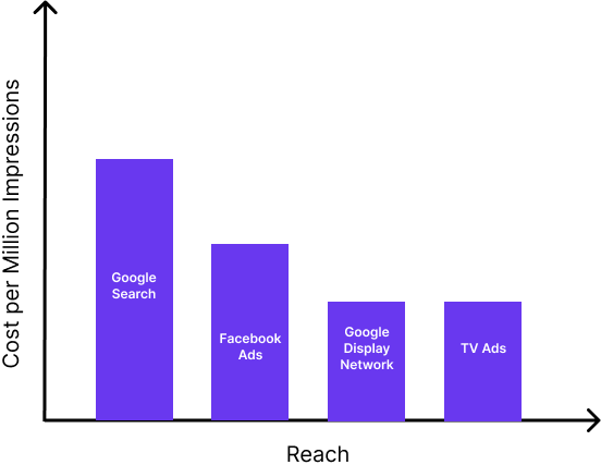 Typically performance channels have a good performance but they offer limited reach for certain use cases. Even a popular category such as “Shampoo” has less than 2K Monthly searches. Now it is evident from the above table that if you were in the market to sell shampoo, then you would need to enhance your reach beyond the performance channels. In such a case the companies have to resort to
