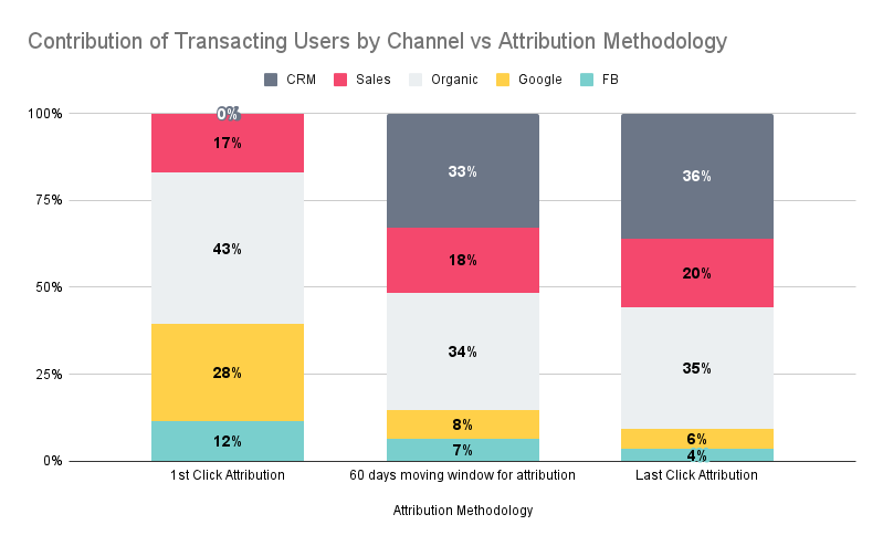What if we carry the 1st click attribution for 60 days only and post that every channel gets a 60-day window from touchpoint to transaction