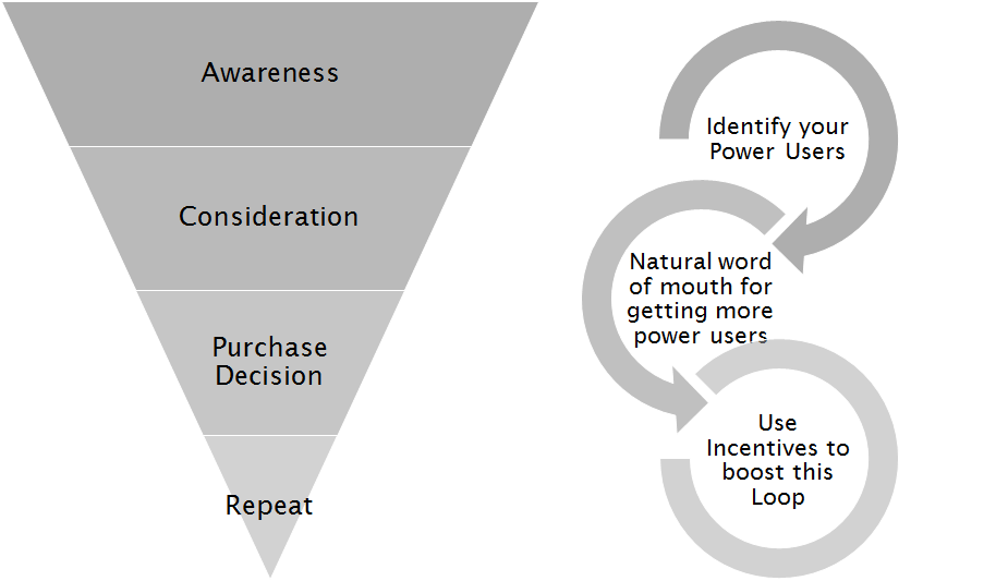 While we all have been brought up (read trained) to think of growth in terms of the funnel on left. But it makes absolute sense to also traverse the path reverse for your power users, especially if you are a small company. The same has been deployed by most successful companies when they were small, and before they had Big money to spend on Marketing. The same concept is explained beautifully in this article by