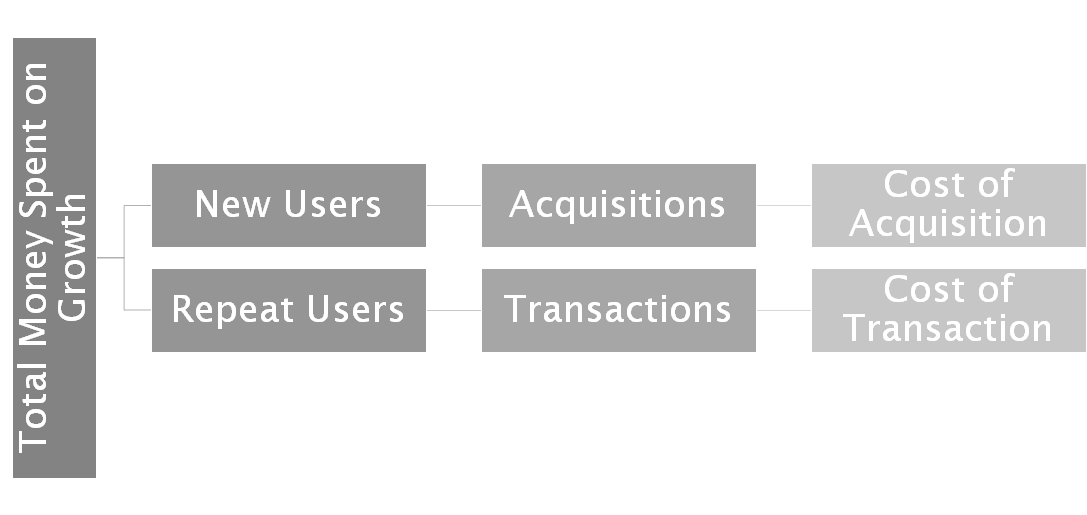 It makes a lot of financial sense for the company to understand what are the avenues to spend the money and get a return on investment. There are basically new user costs and transaction costs. In the two scenarios as shown in cost structure, the ROIs are very differently evaluated. (definition: Return on Investment = What you get back per dollar invested)