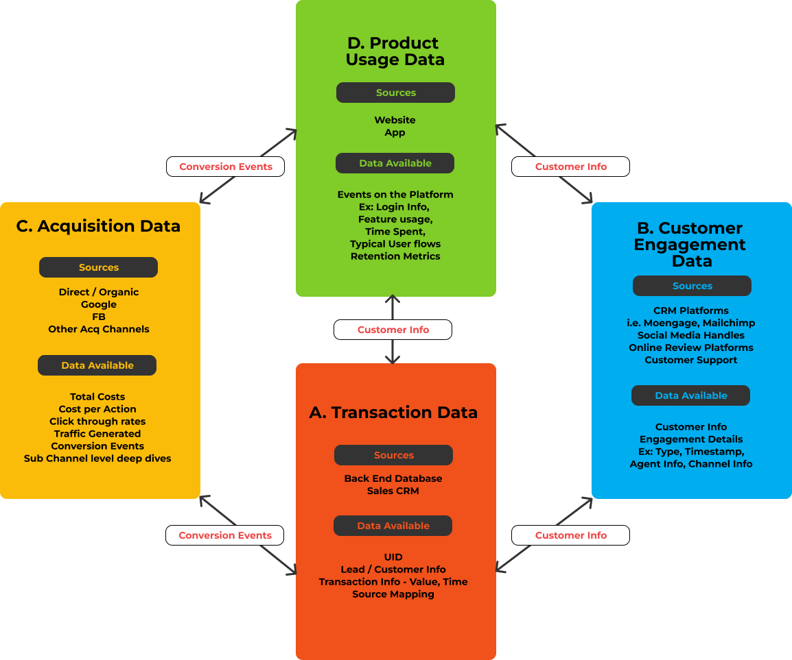 Acquisition Data starts to evolve as soon as basic marketing or growth activities start to take their feet. While both Transaction data and Customer Experience data typically evolve internally, Acquisition Data typically relies on some major Advertising Channels (i.e. Google, FB, etc.) for one reason. These platforms offer pretty holistic reporting frameworks to begin with, which serves most of the use cases. The only exception to this is Referral or Organic Marketing. (Typically referral marketing requires an internal analytics approach as its a product built in-house, however with the advent of referral marketing SAAS platforms, this may change in the future)